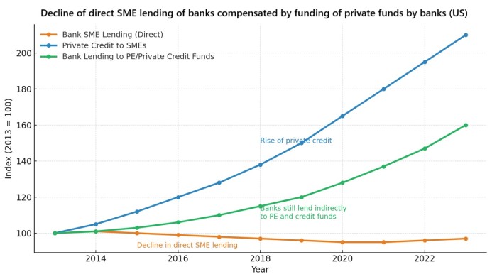 Figure 2: Development of direct bank loans to SMEs, private credit financing and bank loans to private credit and private equity funds (index 2013=100, illustrative)