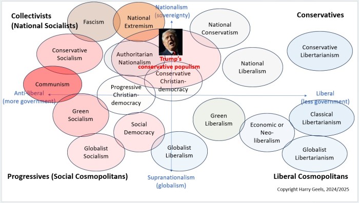 This development is not a coincidence, but follows logically from Trump's political position, which I have previously called conservative populism. In my axis approach to political ideologies, Trump is at the intersection of Conservative Nationalism, Conservative Christianity, and National Authoritarianism (see Figure 2). The nationalist motive legitimizes protectionism and economic chauvinism, the Christian foundation provides a moral framework for economic choices, and the authoritarian element justifies direct state control.